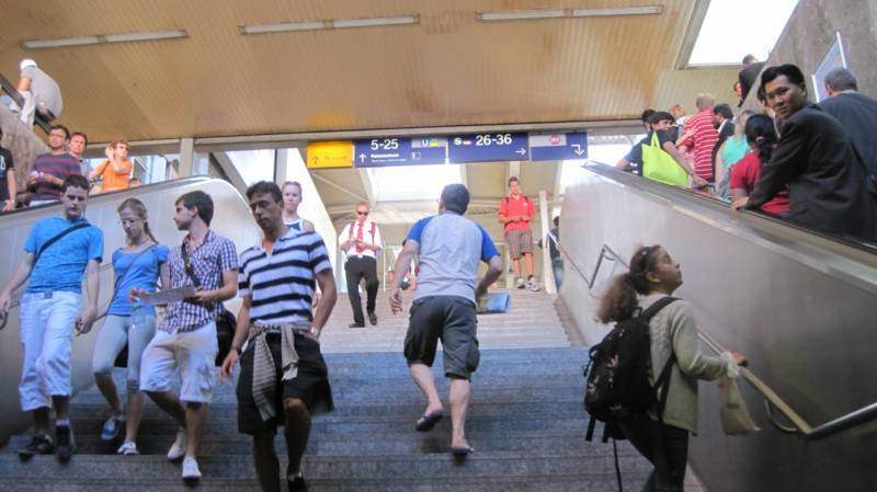 На ней выходы к платформам поездов S-Bahn отмечены буквой S в зеленом кружочке. Они расположены прямо под зданием вокзала, поэтому туда необходимо спускаться по лестнице или на эскалаторе. Вот фото одного из выходов к перрону.