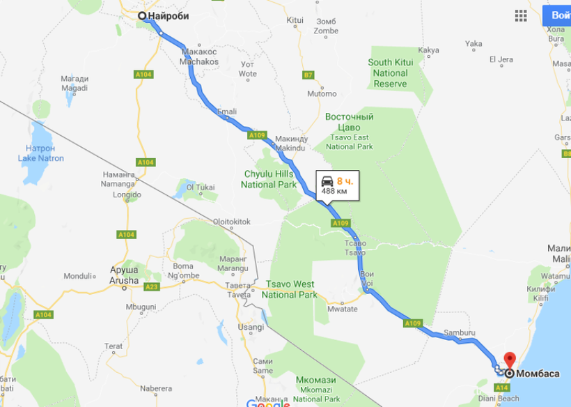 Найроби — Момбаса — маршрут на карте
