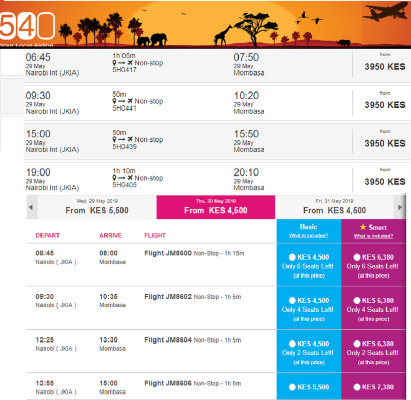 Проще всего для меня билеты на самолеты всех авиакомпаний мира искать, например, тут. Но также билеты из Найроби в Момбасу можно купить на сайтах Kenya Airways, Fly540 и Jambojet Limited.