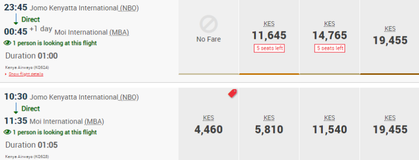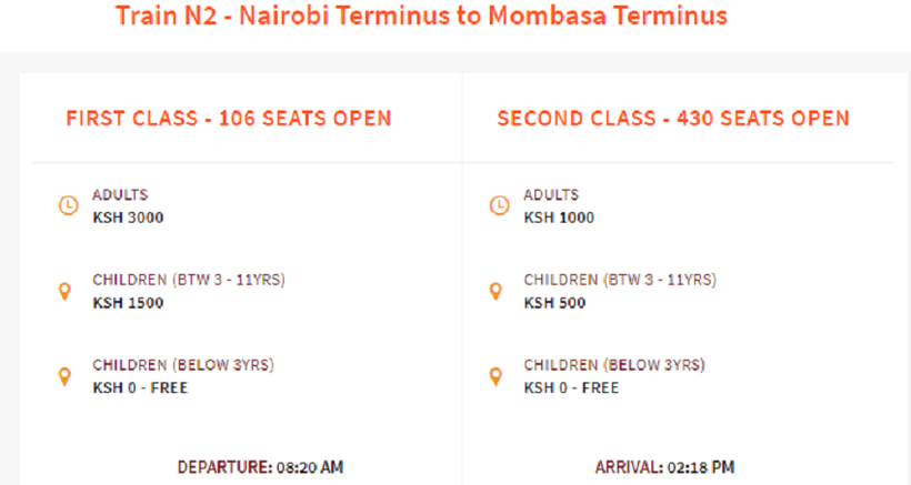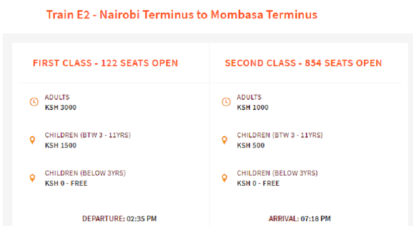 Несмотря на то, что время в пути у двух поездов на маршруте Найроби — Момбаса отличается, цены на билеты на них одинаковые. Так, поездка в вагоне 2-го класса обойдется в 1000 кенийских шиллингов (10 $ или 650 руб.), а в вагоне 1-го класса — в 3000 шиллингов (30 $ или 1950 руб.).