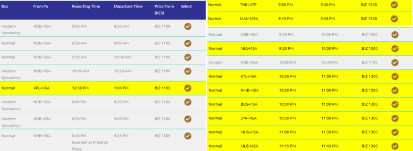 Доехать в Момбасу из Найроби можно и на автобусах компании Modern Coast, которые ежедневно отправляются по маршруту в утреннее время с 08:30 до 12:30, и в вечернее — с 20:30 до 23:45.