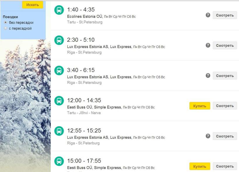 Точка прибытия – автовокзал в Нарве, который расположен на Vaksali 25. Перевозчиков на этом маршруте несколько, и не очень удобно заходить на разные сайты, чтобы увидеть расписание каждого из них. Зато есть замечательный сайт Tpilet, где собраны все рейсы сразу.