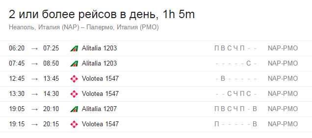Между Неаполем и Палермо летают самолеты двух авиакомпаний: Alitalia и Volotea. Ежедневно совершается не менее двух рейсов, их расписание зависит от дня недели. Ниже я прилагаю график перелетов по маршруту Неаполь-Палермо. В воздухе нужно будет провести около часа.