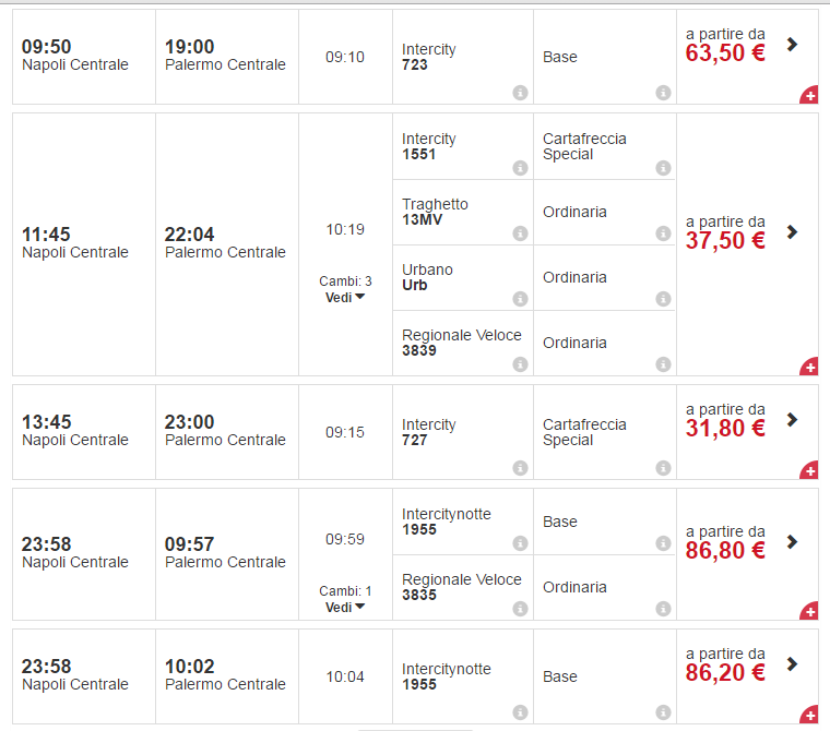Ниже приведена информация о том, сколько часов вам потребуется, чтобы добраться от Неаполя до Палермо, а также приведена примерная стоимость проезда (средняя цена билета) на том или ином виде транспорта.