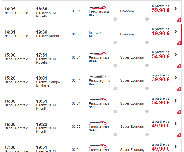 Большинство рейсов из Неаполя во Флоренцию беспересадочные, и только некоторые из них предусматривают наличие пересадки в Риме. Первый поезд выезжает с центрального вокзала Неаполя в 04 часа утра, последний – около 10 часов вечера. В дороге нужно будет провести около от 2,5 до 5 часов в зависимости от категории поезда. Если вам нужно добраться во Флоренцию как можно быстрее, то советую предпочесть сверхскоростной состав класса Frecciarossa или Frecciargento.