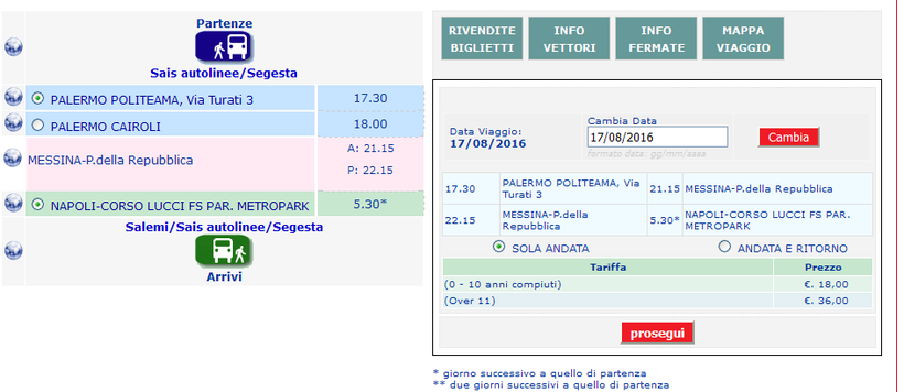 Автобусы компании Salemi отправляются с автовокзала PALERMO POLITEAMA, расположенном по адресу Via Turati, 3, в 17.30. В Неаполь автобус прибывает в 05.30 утра. Автобусы компании S.A.I.S. выезжают на полчаса позже.