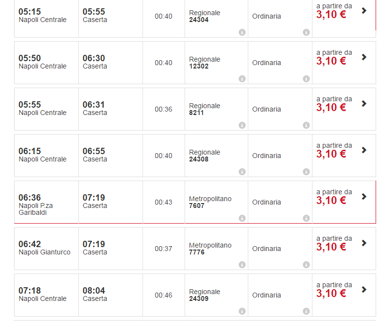 Я всегда стараюсь покупать билеты на поезд через интернет. Так можно посмотреть расписание электрички и выбрать, на какой станции вам будет удобнее всего сесть (большинство электричек в Казерту отправляется из Napoli Centrale, но по дороге делает остановки и на других станциях Неаполя).