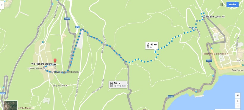 Можно на автобусе 5020 не доезжать до Амальфи, выйдя на остановке в городке Минори, а оттуда пройтись в Равелло пешеходным маршрутом. Пешая прогулка по времени займет один час. Ниже я поместила пешеходный маршрут от автостанции Минори в Равелло. Естественно он подходит только тем туристам, которые путешествуют без огромных чемоданов и имеют хорошую физическую подготовку :).