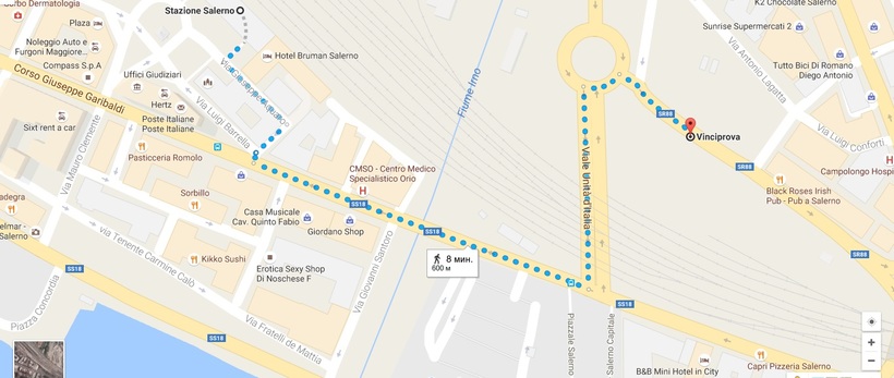 Если решите ехать по этому маршруту, то Вам необходимо на вокзале Napoli Centrale сесть на поезд, следующий в Salerno. Транспортное сообщение между этими городами осуществляют поезда класса Regionale, Intercity, Intercitynotte, Frecciarossa, Frecciabianca и Frecciargento. Информацию об этих поездах можно найти здесь. По времени все поезда в пункт назначения доезжают примерно за 40 минут. Составы в этом направлении отправляются с 05.40 до 22.10 каждые 15-20 минут. Я рекомендую путешествие осуществлять на электричках Regionale, так как не вижу смысла переплачивать за поездку на более комфортных поездах. Из Неаполя в Салерно также можно добраться и другим способом. В Салерно от вокзала необходимо пройтись 500-600 метров к автостанции Vinciprova.