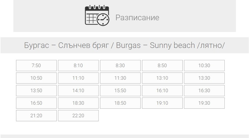 Автобусы прибывают на автостанцию (автогара) «Юг» (подробнее об этом вокзале можно почитать здесь и здесь). А это летнее расписание рейсов компании «Минибус Экспресс» из Бургаса в Солнечный берег, следующих через Несебр.