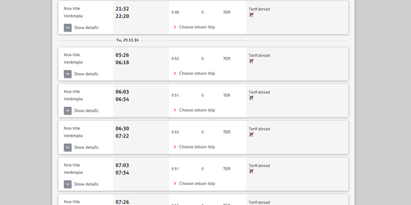 Из Ниццы в Вентимилью можно добраться поездом. С вокзала Nice Ville каждый час уходит поезд, на котором можно доехать до Вентимильи. Выходить нужно на восьмой по счёту остановке, она так и называется – Вентимилья. Внимательно следите за станциями, так как названия станций объявляют на французском языке. Станция Вентимилья следующая, после станции Menton Garavan. Не пропустите! Первый поезд выходит в 5.26 утра, последний в 21.32, в пути придётся провести около 40 минут. Более подробно узнать расписание можно вот здесь. А если вы никогда не пользовались раньше железными дорогами во Франции, то вот тут можно найти много полезной информации.