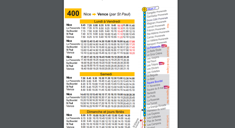 Если вы не хотите брать в аренду автомобиль, то проще всего будет добраться в коммуну Ванс на городском автобусе. Между Ницей и Сен-Поль-де-Вансом ездит автобус №400. Транспорт курсирует с 06:45 до 20:30, отправляясь с остановки Nice Albert 1er каждые 30-45 минут. И в Ницце, и в Сен-Поль-де-Вансе автобусы делают несколько остановок, поэтому необязательно идти на конечную станцию. Правда, если садиться где-то в центре города, то есть шансы, что сидячих мест уже не окажется. В дороге нужно будет провести примерно час.