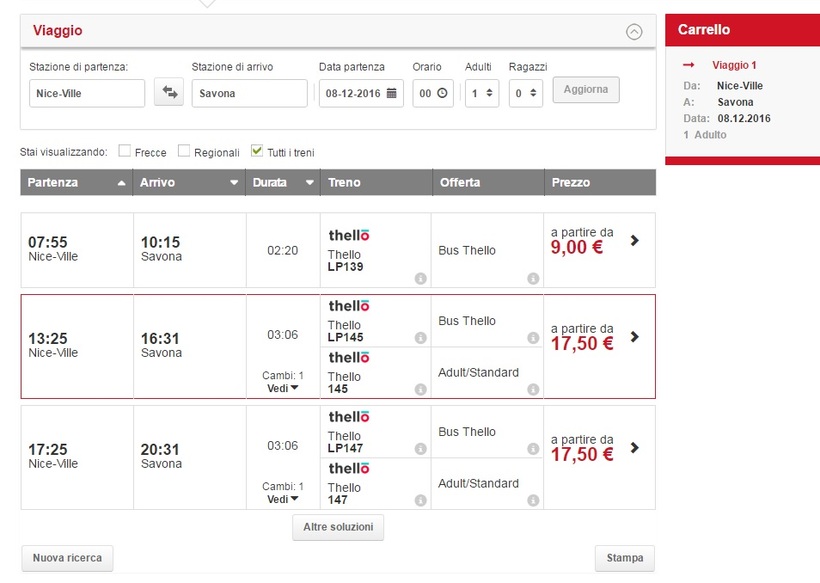 Теперь о расписании. Поезда отправляются от станции «Nice-Ville» и следуют до «Savona», именно эти названия нужно вводить на сайте итальянских железных дорог. Также купить билеты и посмотреть расписание можно и на французском сайте, но итальянский мне нравится больше.