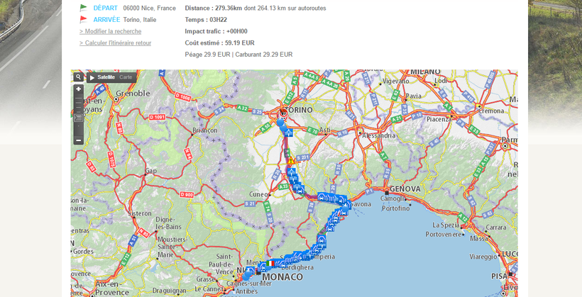 Расстояние между Ниццей и Турином составляет 106 километров или 66 миль по прямой и 279 километров или 173 мили по автодорогам.