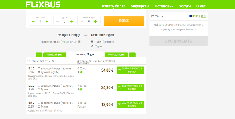 Добраться на автобусе FlixBus можно с пересадкой в Генуе (выезд с автостанции, расположенной у выхода с аэропорта в 12:20) или без пересадки (выезд тоже от аэропорта в 18:50). Конечно, удобнее всего ехать без пересадок – в таком случае дорога займет всего чуть более 3,5 часов.