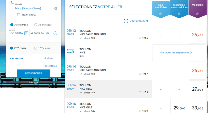 Из Тулона в Ниццу ежедневно курсирует большое количество поездов с интервалом от одного часа до полутора. Первый рейс уже доступен в 06.13, а последний отправляется в 21.14. Можно воспользоваться как прямыми поездами или с пересадками в Антибе, по времени получается одинаково.