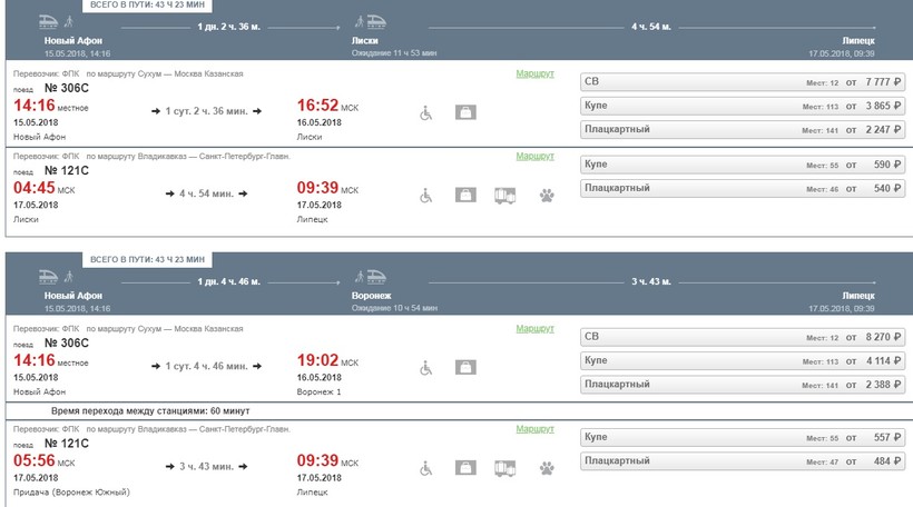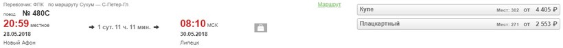 Еще есть поезд 306С Сухум — Москва, вот он отправляется ежедневно, но в Липецк не заезжает. На нем можно доехать до Воронежа или Усмани, сайт РЖД сам подбирает варианты с пересадкой, только смотрите внимательно, например, в Воронеже нужно переехать с одного вокзала на другой: