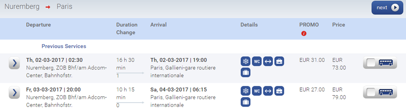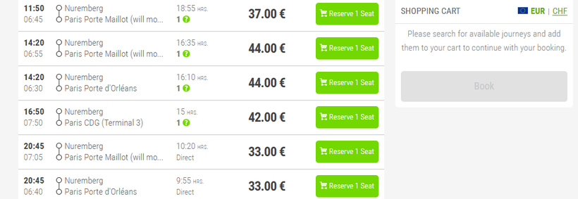 Расписание движения автобусов по маршруту Нюрнберг - Париж лучше всего смотрите на официальных сайтах компаний, что занимаются перевозками, их я укажу ниже.