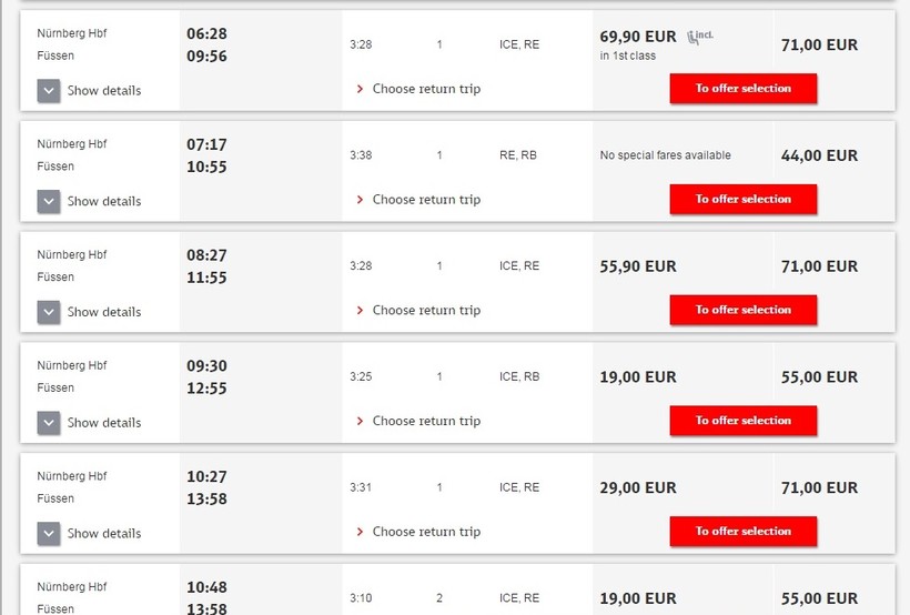 Перед поездкой в Фюссен я зашла на сайт Deutsche Bahn. Оказалось, что прямых рейсов из Нюрнберга в этот город нет. Необходимо делать пересадку в Мюнхене или в Аугсбурге. Есть еще более сложные варианты с несколькими пересадками, но я их не рассматривала. Билеты решила покупать на поезда с пересадкой в Аугсбурге на утренний рейс. Вот фрагмент расписания утренних поездов по направлению Нюрнберг-Фюссен.