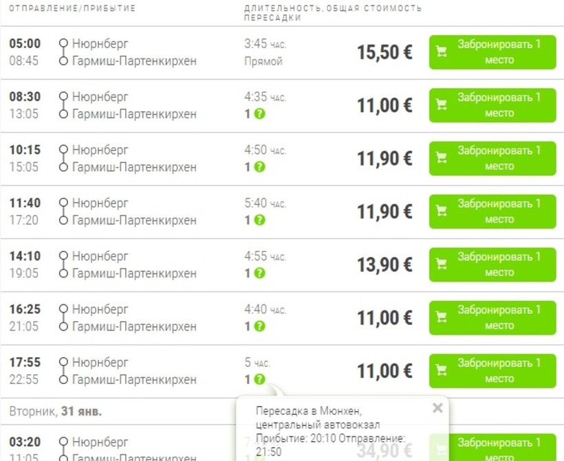 Прямых автобусных рейсов из Нюрнберга в Фюссен тоже нет. В лучшем случае придется добираться на автобусах компании Flixbus с одной пересадкой в городе Гармиш-Партенкирхен. Ежедневно в этот город отправляется только один прямой рейс в пять утра. Вот расположение автовокзала на карте Нюрнберга.Не очень удобно. Все другие рейсы предусматривают еще и дополнительную пересадку в Мюнхене. Вот расписание.