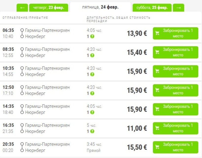 Вот Вам для примера расписание движения автобусов по маршруту Фюссен-Гармиш-Нюрнберг. Сначала выезжаете из Фюссена в Гармиш-Партенкирхен.