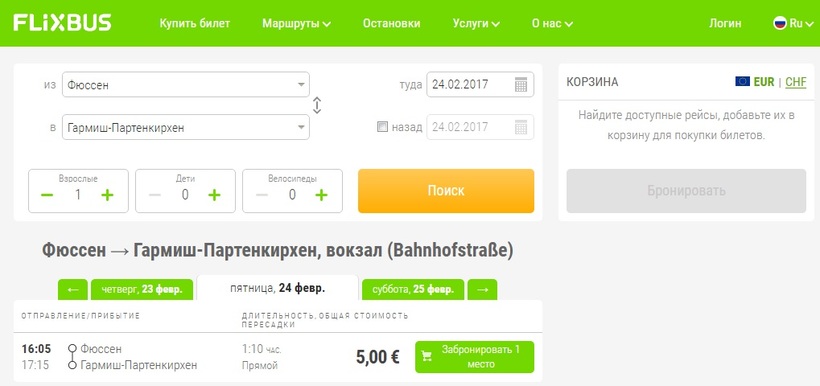 - Рейсы в эти города осуществляются один раз в день и не ежедневно. Например, по вторникам и средам нет рейсов в Гармиш-Партенкирхен, а по средам и четвергам автобусы не ездят в Карлсруэ. Поездку необходимо заранее планировать и тщательно изучать расписание.