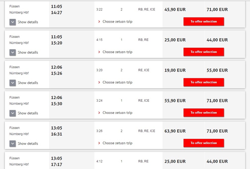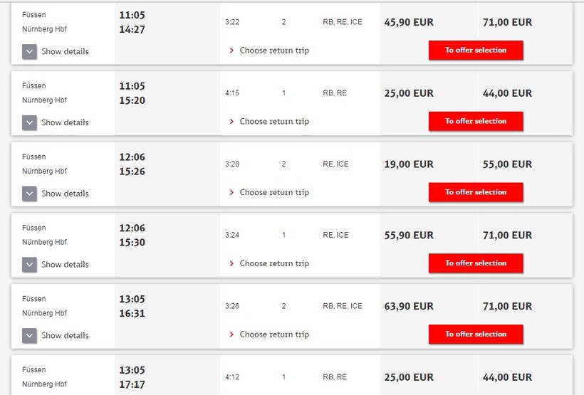 Из Фюссена в Нюрнберг прямых поездов нет. Доехать можно только до Мюнхена или Аугсбурга, а там уже пересесть на поезд, идущий в Нюрнберг. Вот фрагмент расписания с сайта железных дорог Германии (Deutsche Bahn).