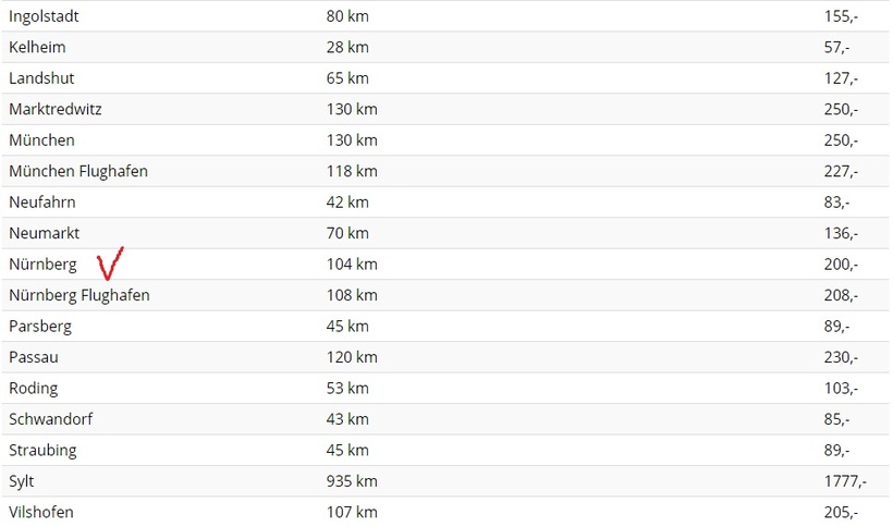 Возвращался он с очень удивленным лицом. Я у него спрашиваю: «Сколько?». А он мне: «200 евро»!!!. Теперь удивленное лицо было у меня. Позже в Интернете я нашла прайс на услуги такси в Регенсбурге. Вот он.