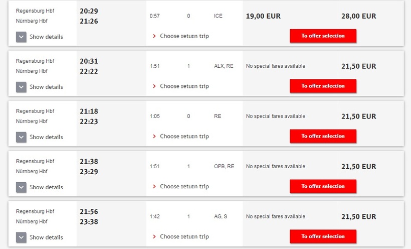 Мы с мужем уезжали вечером, поэтому прилагаю расписание поездов в Нюрнберг в вечернее время.