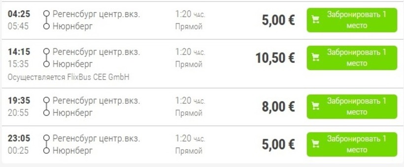 Ежедневно от автостанции Регенсбурга (она расположена напротив железнодорожного вокзала) в Нюрнберг отправляется от трех до четырех автобусных рейсов транспортной компании Flixbus.