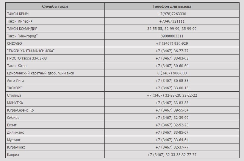 В аэропорту Ханты-Мансийска можно заказать услугу в одной из служб городского такси. Ниже Вы видите названия и контактные данные некоторых компаний, которые предоставляют подобные услуги в городе.