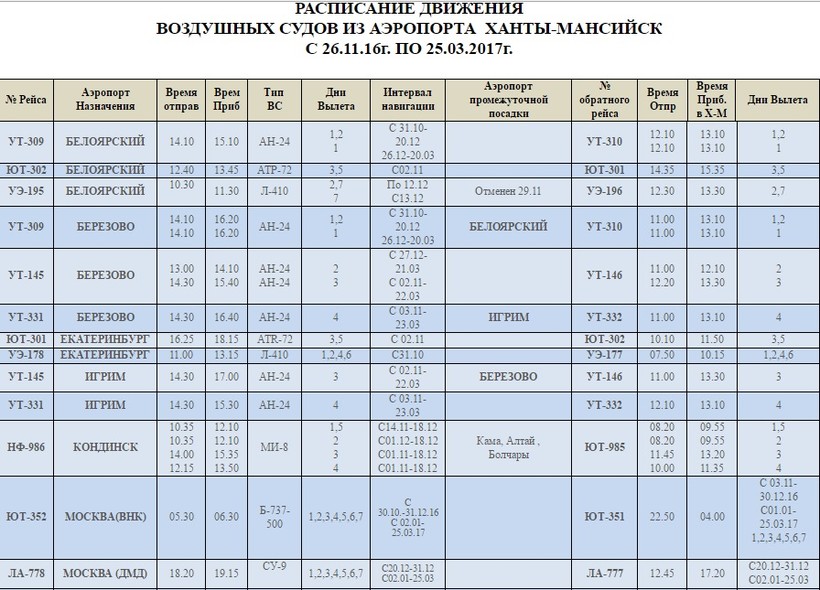 Мы с мужем в Ханты-Мансийск летели из Москвы. Добираться удобно, так как в аэропорт Ханты-Мансийска отсюда есть прямые рейсы из аэропортов Внуково и Домодедово. По времени перелет занимает менее трех часов. Кроме этого, есть прямые рейсы из Уфы, Тюмени, Перми и еще некоторых городов. Вот фрагмент расписания авиарейсов, которые осуществляют вылет и посадку в аэропорту Ханты-Мансийска.