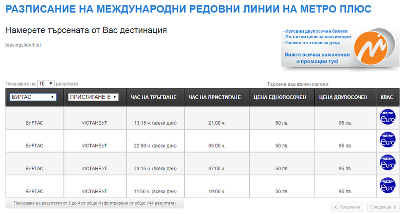 Далее из Бургаса в Стамбул ежедневно курсируют автобусы компании Metro, расписание которых можно посмотреть на сайте этого перевозчика.