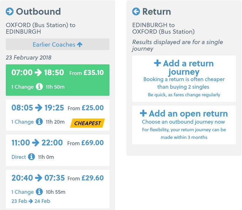 Автобусы прилично уступают по скорости поездам, но зато мне попадались очень выгодные предложения на длительные переезды. Например, у перевозчика Megabus можно купить билет даже за 1 фунт, представляете? И это не маркетинговый ход. К сожалению, из Оксфорда в Эдинбург ездят только автобусы National Express, но и на них можно выгодно добраться до места назначения.