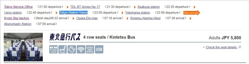 Также можете добраться в Осаку и на автобусе, правда, по времени это будет дольше, чем на поезде. Если выедете вечером, то прибудете в Осаку только утром. Я один раз ездила по этому маршруту с компанией Willer (полное расписание смотрите на их сайте). Села я на Tokyo Station Yaesu в 11 часов вечера. Находится она недалеко от Дворцовой площади, рядом еще проходит улица Яэсу Рут. На скриншоте отметила красным квадратом это место.