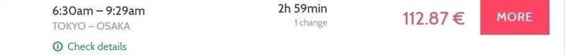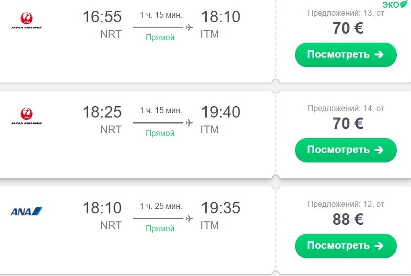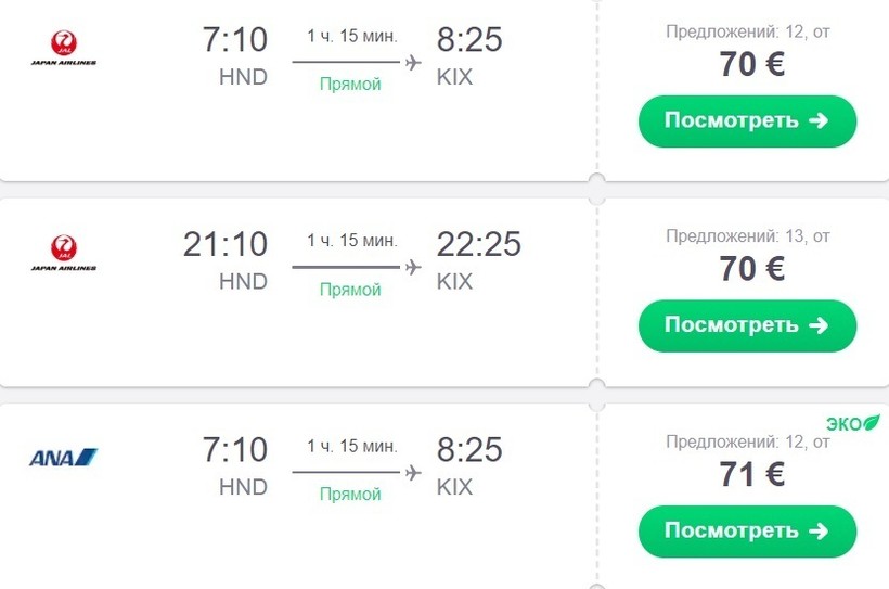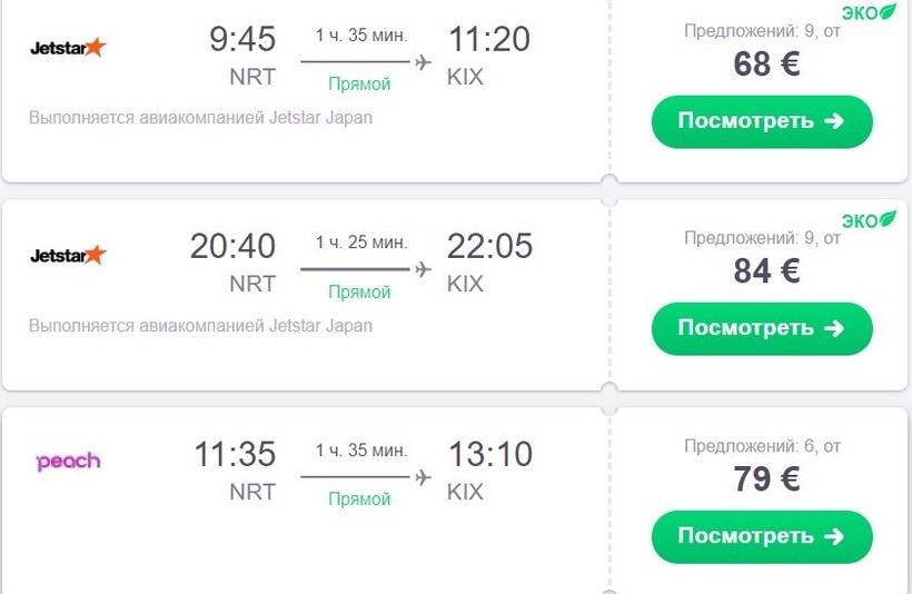 Билет до Осаки вне зависимости от аэропорта можно взять за 70–80 евро (8850–10100 иен или 5150–5880 рублей).