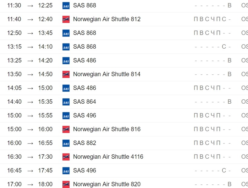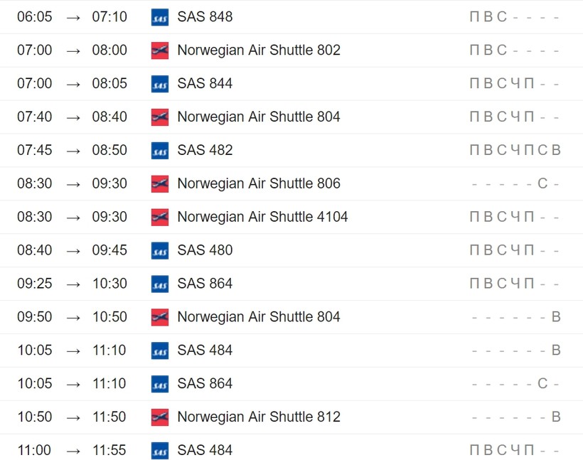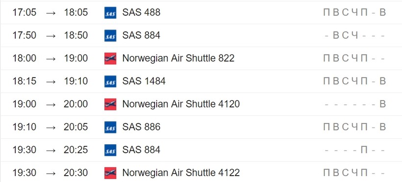 Ходят каждые 20минут. Из аэропорта в сторону Стокгольма перелёты обслуживают две авиакомпании: SAS и Norwegian Air Shuttle.