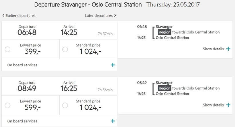 На веб ресурсе норвежской железной дороги указывается две разные цены: дешевле и соответственно дороже. Такое можно увидеть и в терминалах самообслуживания на вокзале.На билеты подешевле есть ограничения: оформлять проездные надо хотя бы за сутки до поездки, сдать или обменять их нельзя, действуют они на конкретный поезд, а иногда даже на вагон и место.