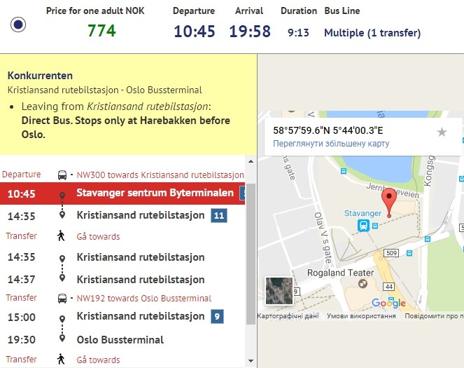 Путешествовать по такому маршруту можно и автобусом. В частности, перевозкой пассажиров из Ставангера в Осло занимается национальная норвежская компания Nor Way Bussekspress. Но прямых рейсов между этими городами нет, ехать надо с пересадкой в Кристиансанне.