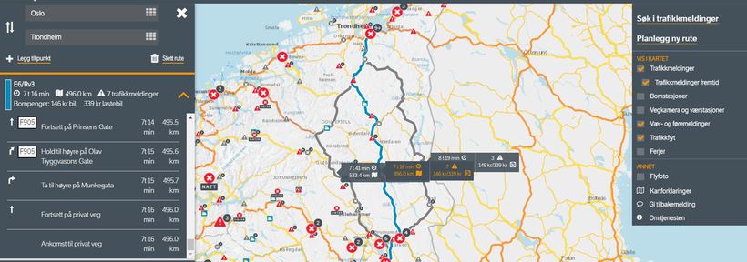 Расстояние между Осло и Тронхеймом составляет 243 километра или 151 миля по прямой и 496 километров или 308 миль по автодорогам.
