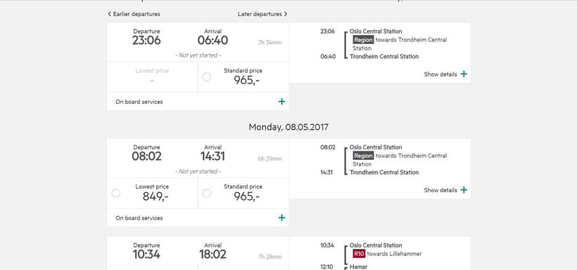 Ну, с вокзалами и их расположением мы уже разобрались выше, поэтому перейду сразу к делу. Вообще, поезда в Норвегии для туристов не самый приемлемый транспорт, потому как они неоправданно дорогие. Вот, приведу ниже скриншот с частью расписания: