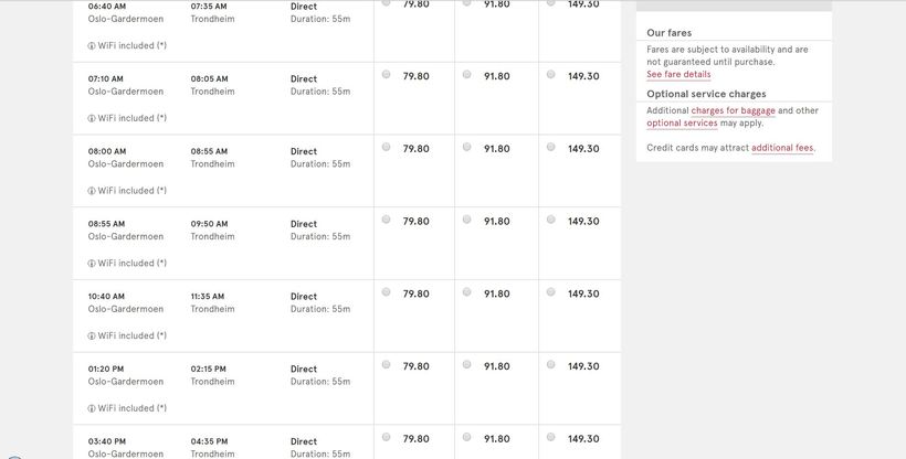 Я очень верю всемирной сети и в ее всесильные возможности, но в данном конкретном случае она меня здорово подвела. На официальном сайте перевозчика NOR-WAY, которые вроде бы как ведает перевозками никакой информации о рейсах из Осло в Тронхейм не нашлось, какую бы дату я не выбирал. Но вот в самом Осло я узнал, что рейсы все же есть, просто надо смотреть на другом сервисе. Я не замедлил воспользоваться советом и вот что я увидел: