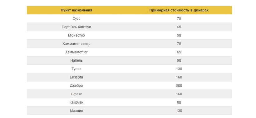 Теоретически, дневная поездка на расстояние в 15 километров из аэропорта Монастир в Сусс обошлась бы Вам в 11 тунисских динаров (4,5 евро) на желтом такси или в 19 динаров (7,8 евро) на белой машине. Но в туристических районах страны таксисты забывают о счетчиках и везут туристов только по фиксированной цене. Проезд из аэропорта до Сусса обойдется в 30 динар или чуть больше 12 евро. Рассчитываться с водителями можно в динарах, евро или долларах. Вот таблица приблизительных цен в тунисских динарах на проезд от аэропорта до некоторых городов страны.