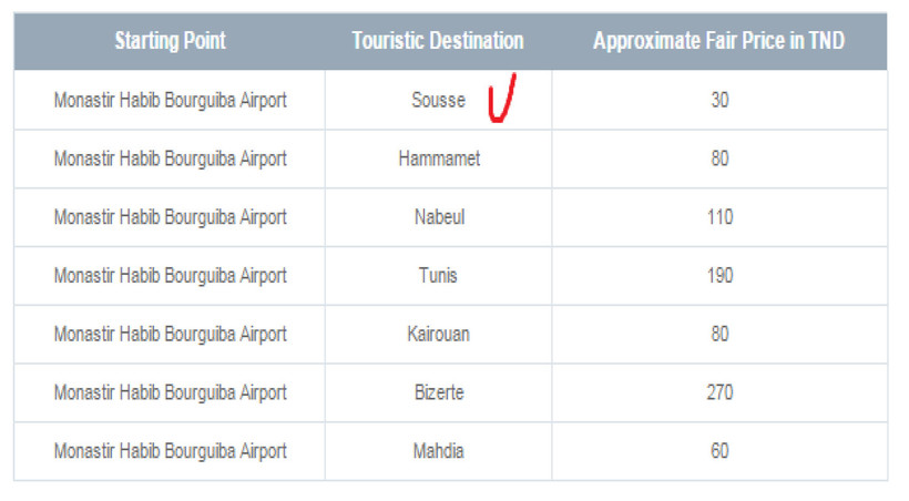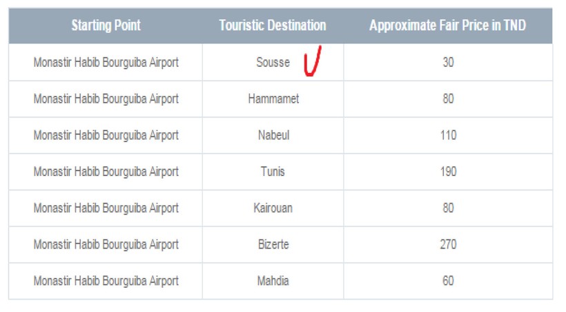 В аэропорту Энфида работает только белое такси. Как я уже писала, таксисты в аэропортах Туниса возят пассажиров по фиксированному тарифу. Ниже приведена стоимость проезда из Энфиды в Сусс и другие города страны.