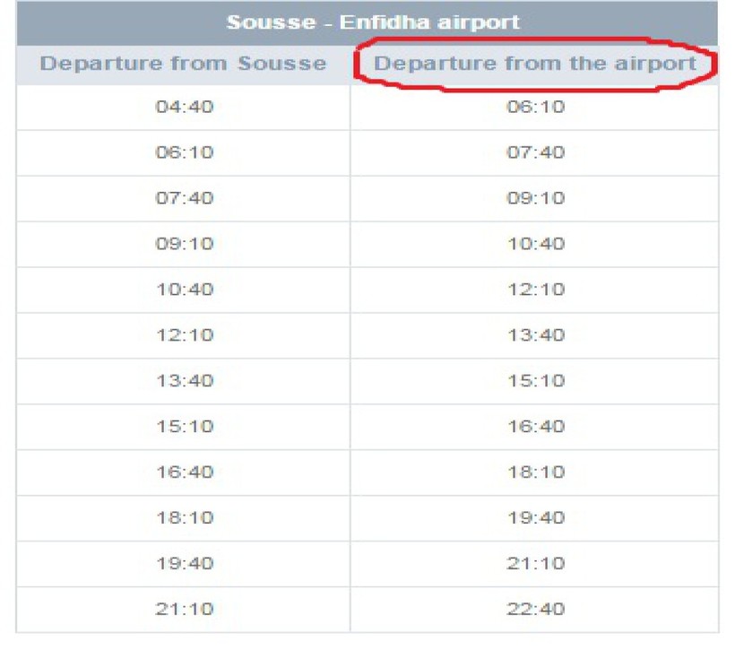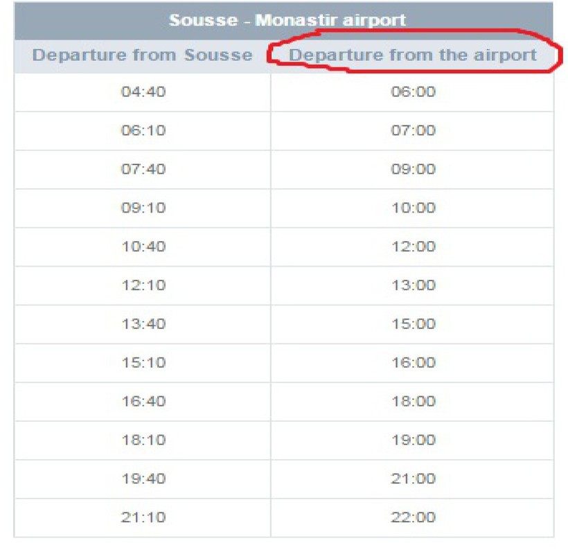 Ежедневно с шести утра до 10 вечера от аэропорта в направлении Сусса отправляется автобус №52 транспортной компании STS. Интервал между рейсами составляет 1-2 часа. Ниже размещено расписание отправления автобусов из аэропорта в Сусс (обведено красным кружком) и обратно.