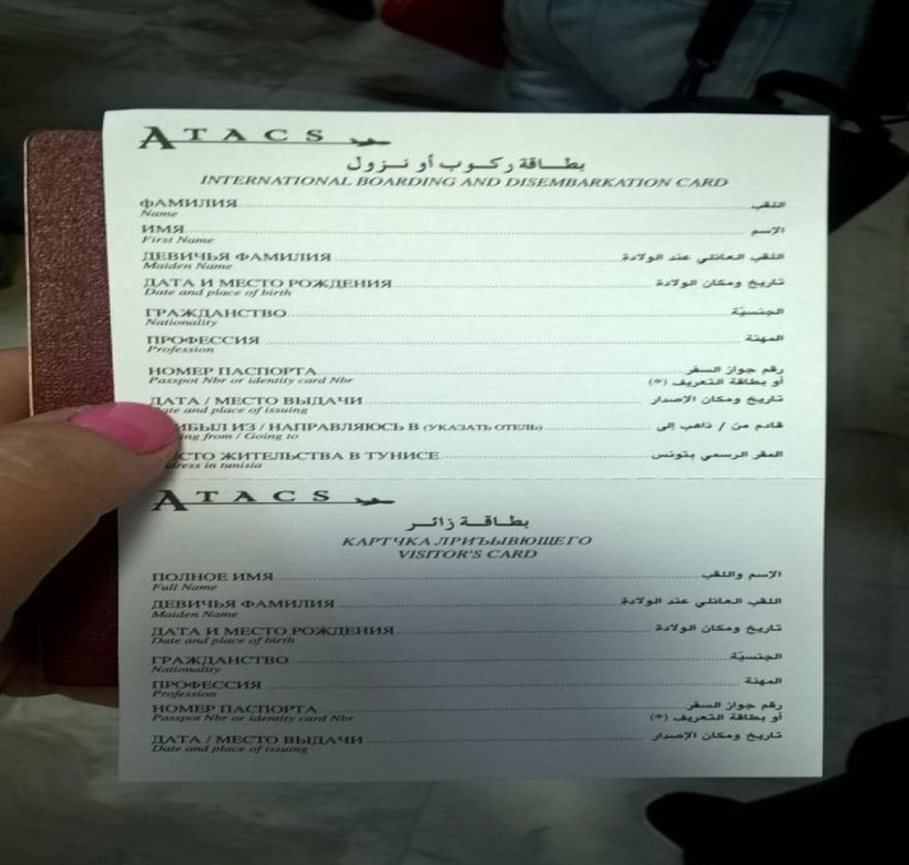 Знакомство с миграционными правилами Туниса начинается еще в самолете. Во время полета стюардессы раздали всем пассажирам миграционные карты. Сложностей с заполнением этого документа особых нет, так как, что и куда необходимо написать указано на нескольких языках (в том числе и на русском).
