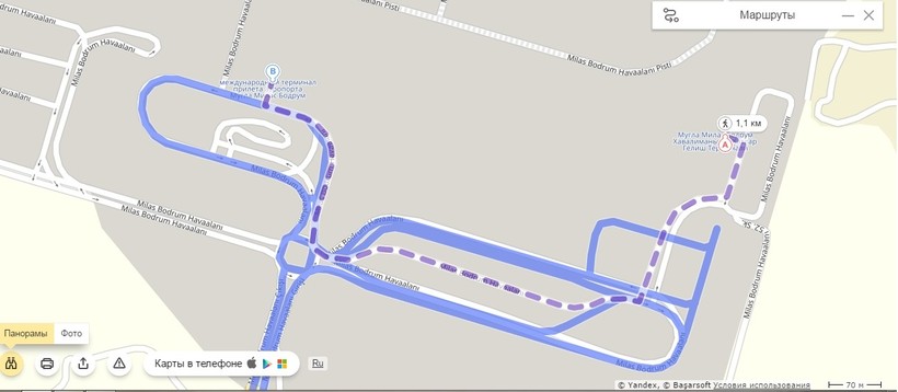 Что касается аэропорта Bodrum Milas, то расположен он в 36 километрах от Бодрума и состоит из двух небольших терминалов (для внутренних и международных рейсов). Расстояние между ними составляет чуть больше одного километра и транспортное сообщение отсутствует. Ниже я указала, как дойти пешком от одного терминала к другому.