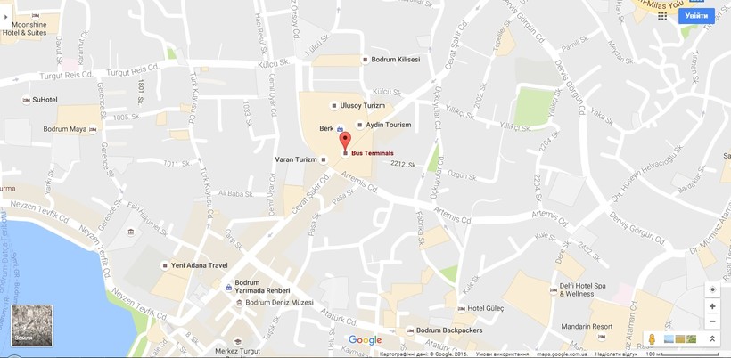 На автобусе Хаваш до автостанции Бодрума мы с мужем доехали за 45 минут (это конечная остановка). Хотя на автостанцию это место не особо похоже :). Здания вокзала и билетных касс здесь нет. Место представляет собой довольно большую площадь, с одной стороны которой расположены кафе и сувенирные магазинчики, а с другой – офисы транспортных компаний, которые осуществляют перевозку пассажиров в различные города Турции. После покупки билетов, автобус можно подождать в офисе компании-перевозчика (помещения с кондиционером и мягкими диванами) или же за столиком любого кафетерия. Если позволяет время, и нет желания ожидать свой рейс автобуса на автостанции, то можете прогуляться по центральному рынку города или супермаркету Мигрос, которые расположены сразу за автостанцией.