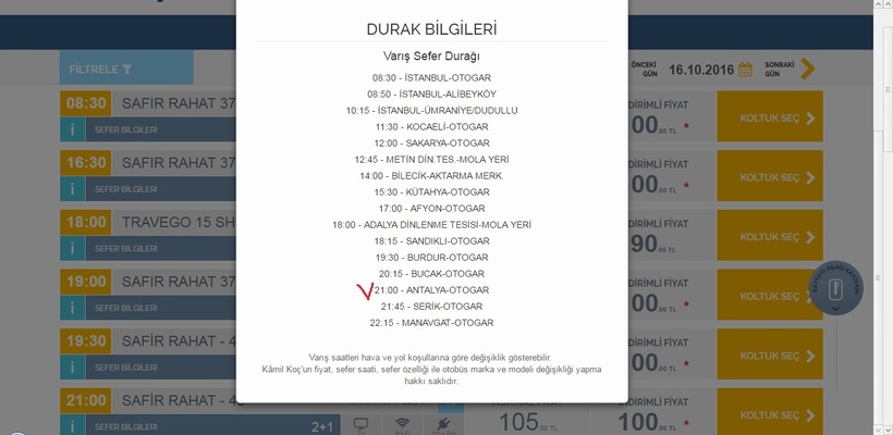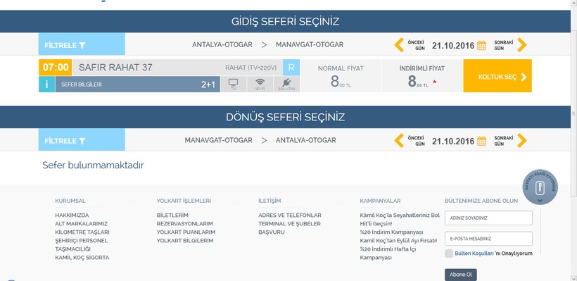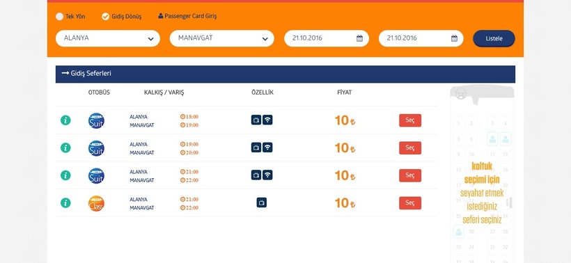 Например, сайт компании Kamilkoc предлагает билеты по маршруту Анталия-Манавгат только на один рейс, который отправляется в 7.00.