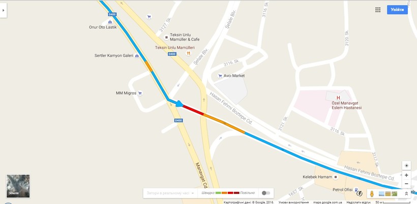 При наличии водительских прав в аэропорту Анталии можно взять напрокат автомобиль. На арендованной машине в Манавгат Вы доедете за один час. По трассе D400 нужно доехать до торгового цента Мигрос (этот супермаркет будет находиться справа). В этом месте необходимо будет с трассы повернуть в левую сторону в направлении Манавгата. Торговый центр Мигрос и поворот на Манавгат